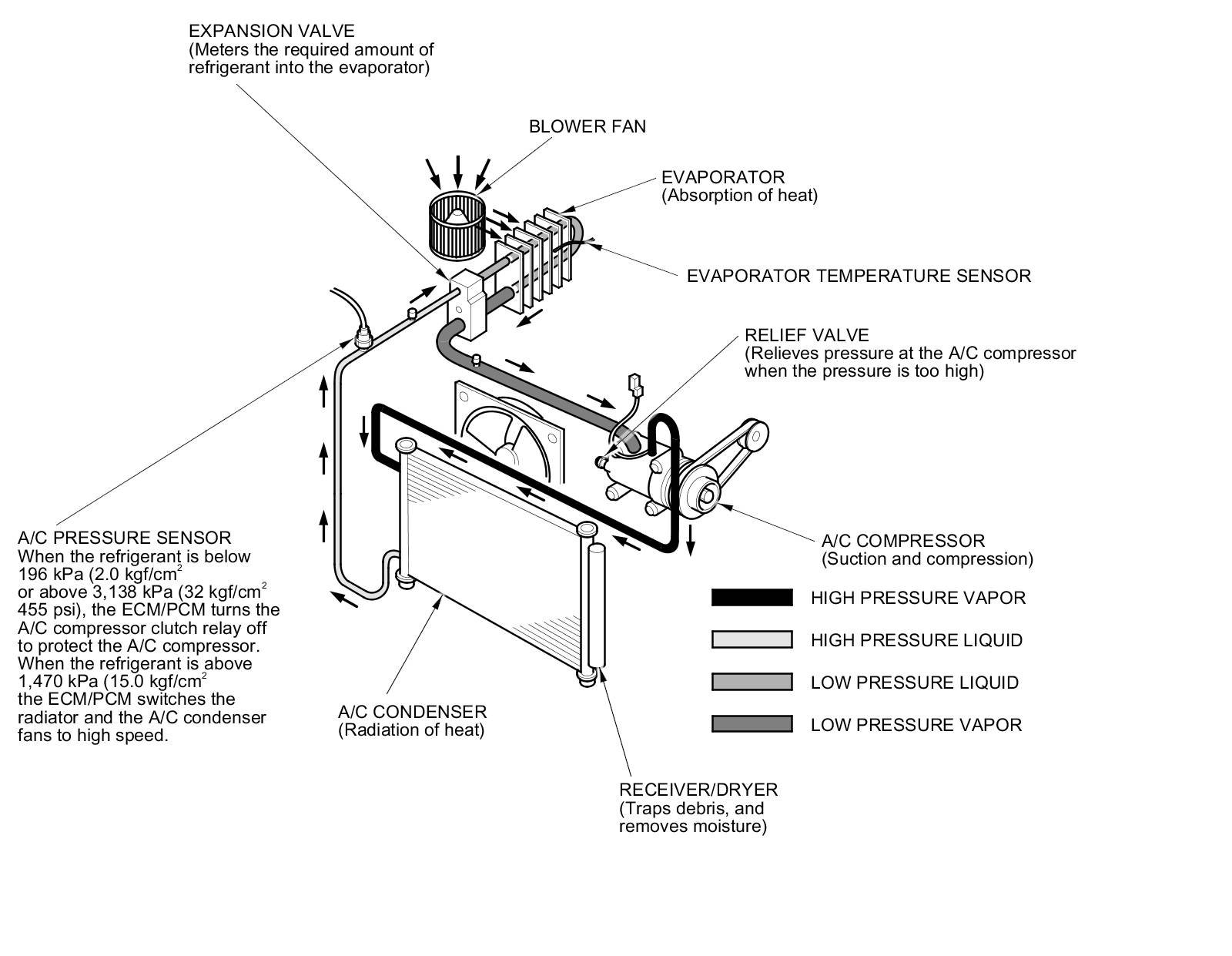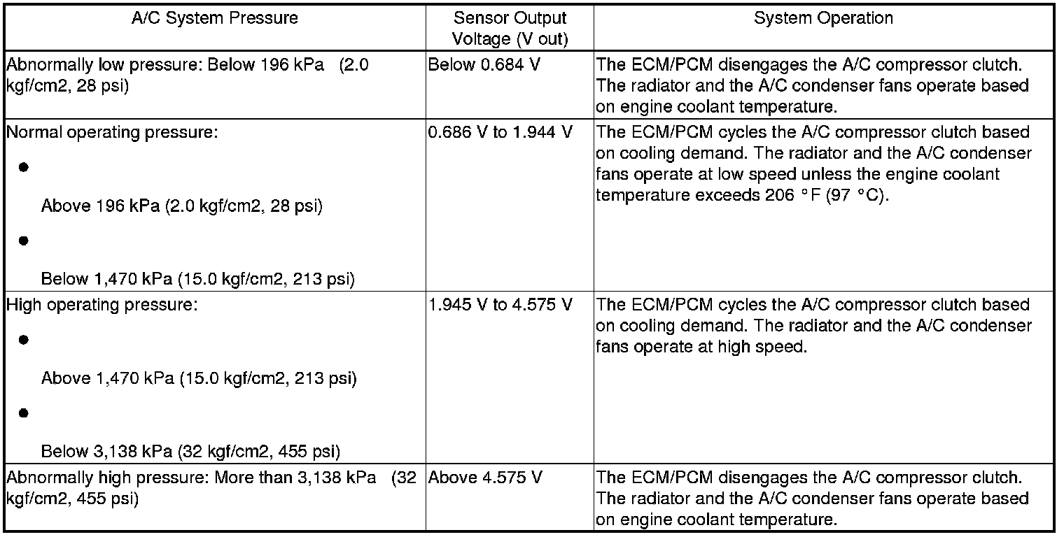 NOTE: When the refrigerant is below 196 kPa (2.0 kgf/cm2, 28 psi) or above 3,138 kPa (32 kgf/cm2, 455 psi), the ECM/PCM turns the A/C compressor clutch relay off to protect the A/C compressor. When the refrigerant pressure is above 1,470 kPa (15.0 kgf/cm2, 213 psi), the ECM/PCM switches the radiator and the A/C condenser fans to high speed.
