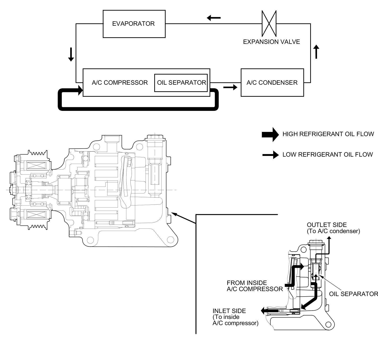 Oil emission from the A/C compressor to the A/C line is reduced by placing the oil separator in the A/C compressor. This results in a thinner oil film inside of the heat exchanger (A/C condenser and evaporator). Air conditioning efficiency is increased without sacrificing engine performance.