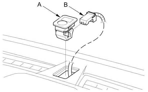 1. Using a flat-tip screwdriver wrapped with protective tape, pry up the sunlight sensor (A) from the dashboard, then disconnect the connector (B). Be careful not to damage the sensor and the dashboard.
