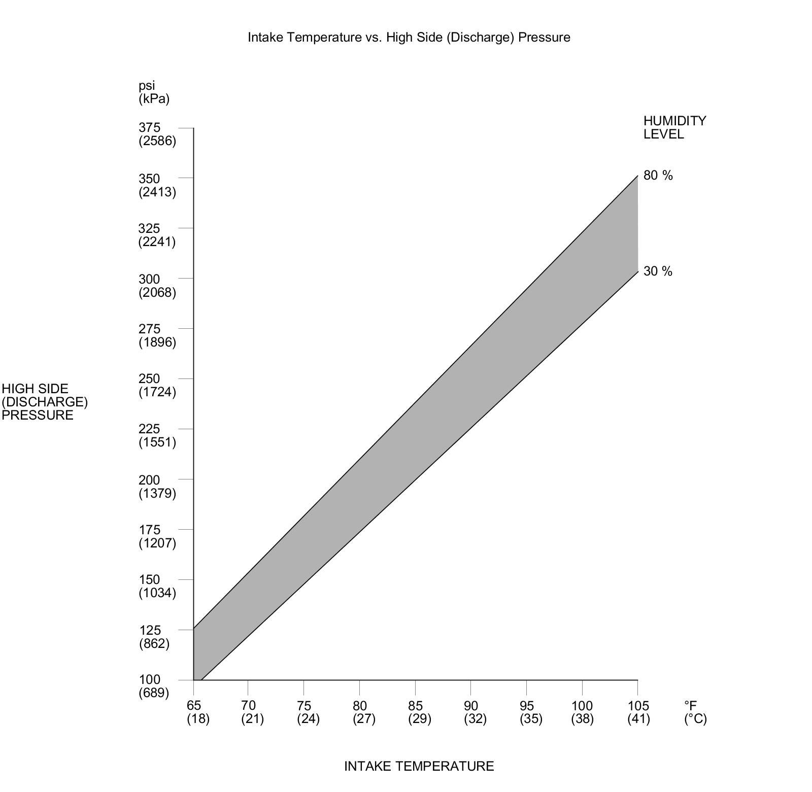 NOTE: The high side pressure and the intake temperature should intersect in the shaded area. Any measurements outside the area may indicate the need for further inspection.