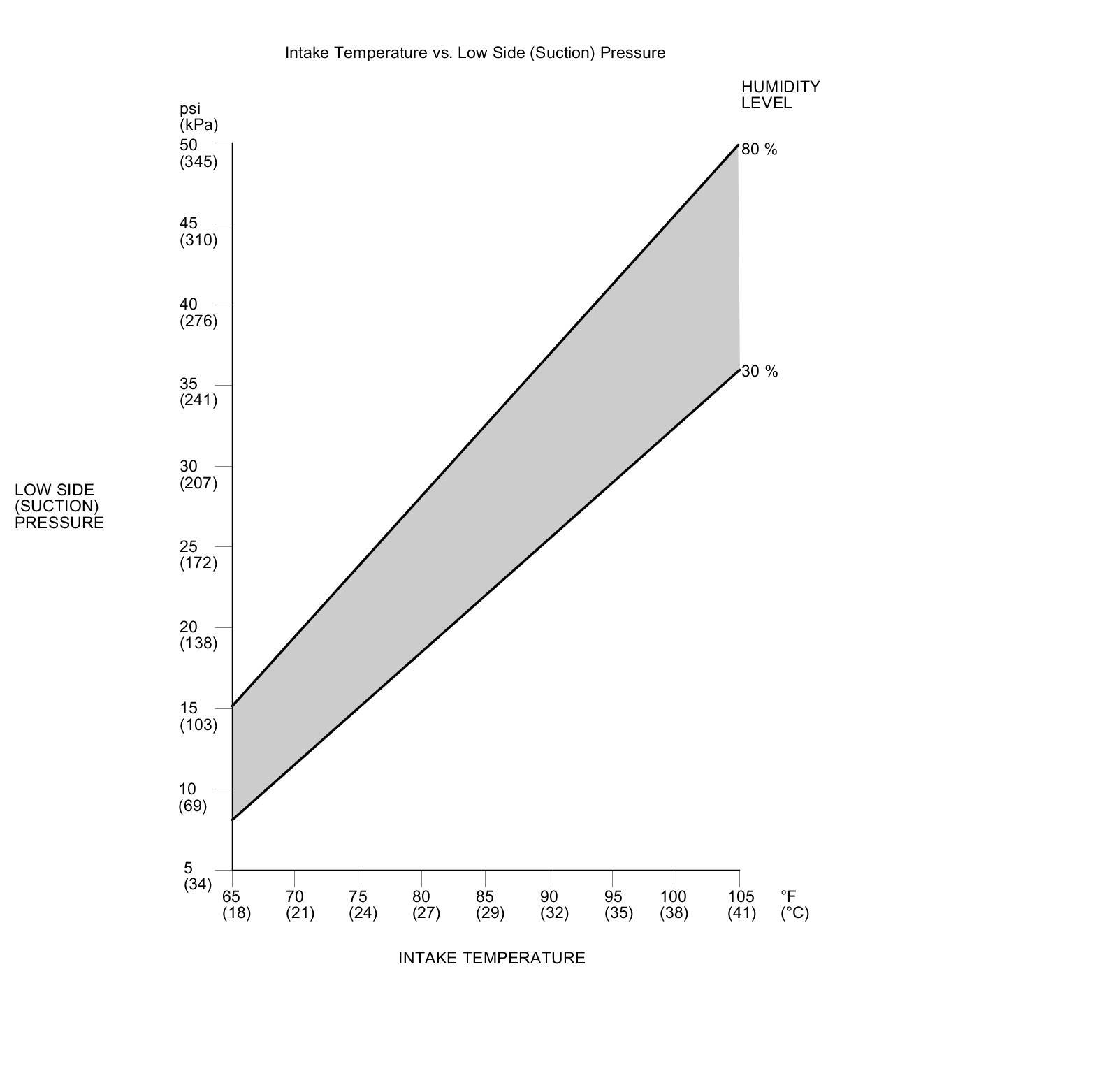 NOTE: The low side pressure and the intake temperature should intersect in the shaded area. Any measurements outside the area may indicate the need for further inspection.