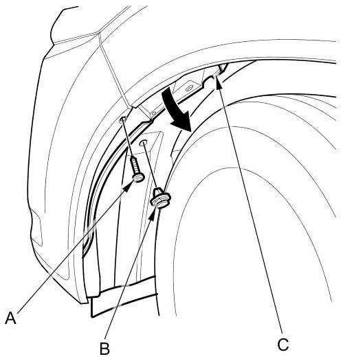 2. Remove the screw (A) and clip (B) from the front inner fender (C), then pull back the inner fender as needed to access the headlight cover.