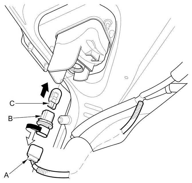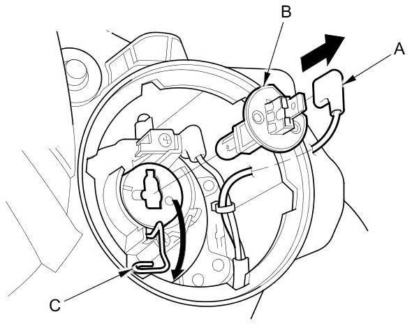 6. Pull the retaining spring (C) away from the bulb then remove the bulb.