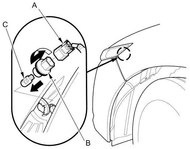 3. Turn the bulb socket (B) 45 ° counterclockwise to remove the bulb (C).