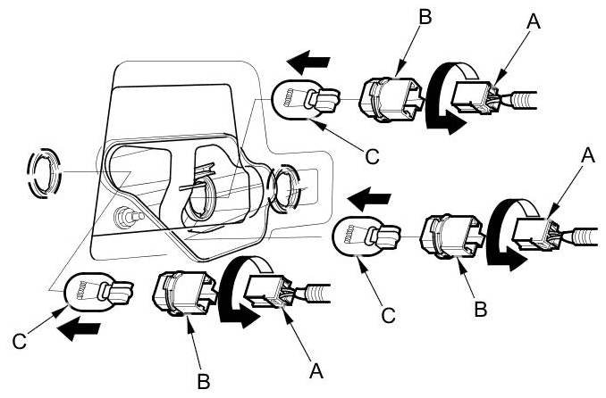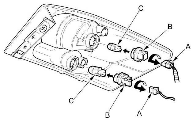 3. Turn the bulb sockets (B) 45 ° counterclockwise to remove the bulbs (C).