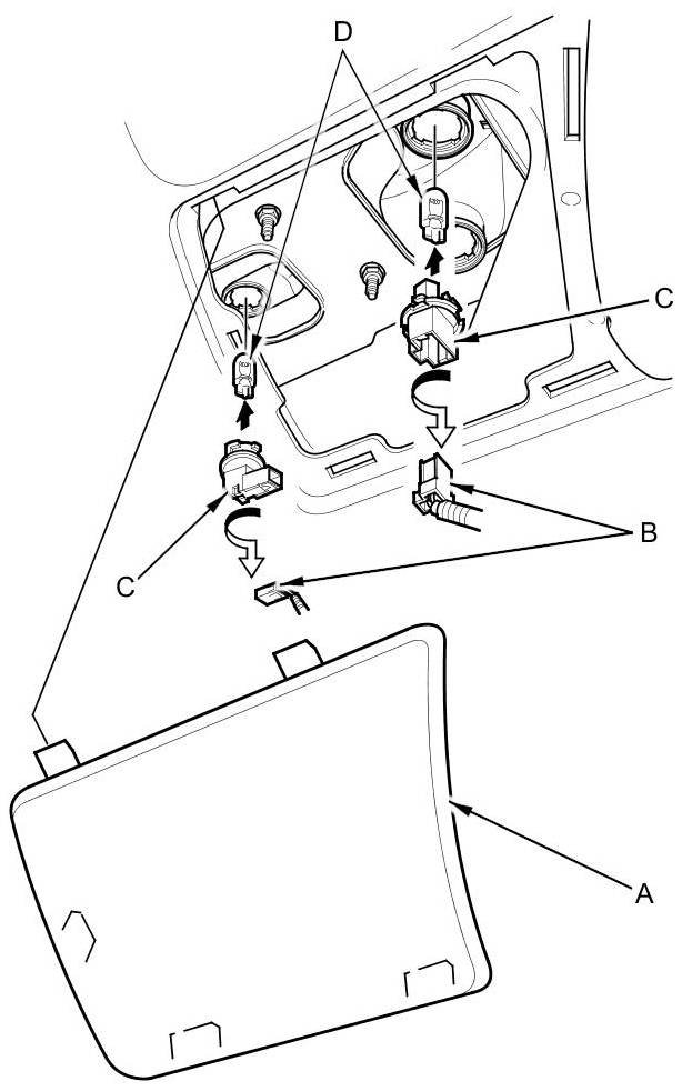 2. Turn the bulb sockets (C) 45 ° counterclockwise to remove the bulbs (D).