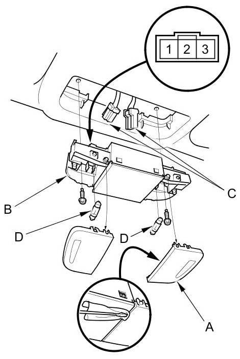 6. If the continuity is not as specified, check the bulb(s) (D). If the bulb(s) are OK, replace the map lights.