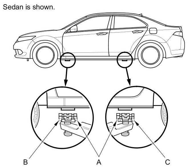 1. Position the lift pads (A) under the vehicle's front support points (B) and rear support points (C).