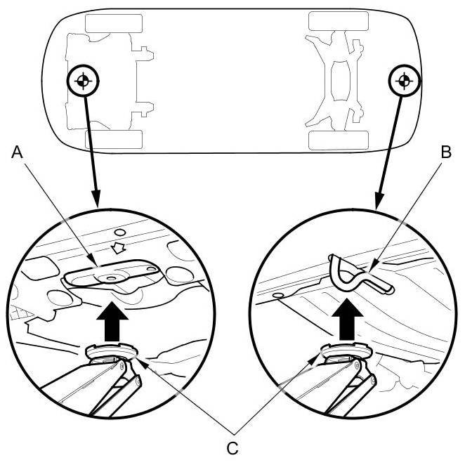 3. Position the floor jack under the front jacking bracket (A) or the rear jacking bracket (B). Center the jacking bracket on the jack lift platform (C), and jack up the vehicle high enough to fit the safety stands under it.