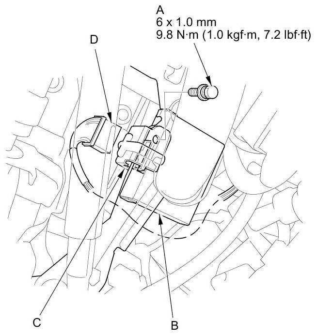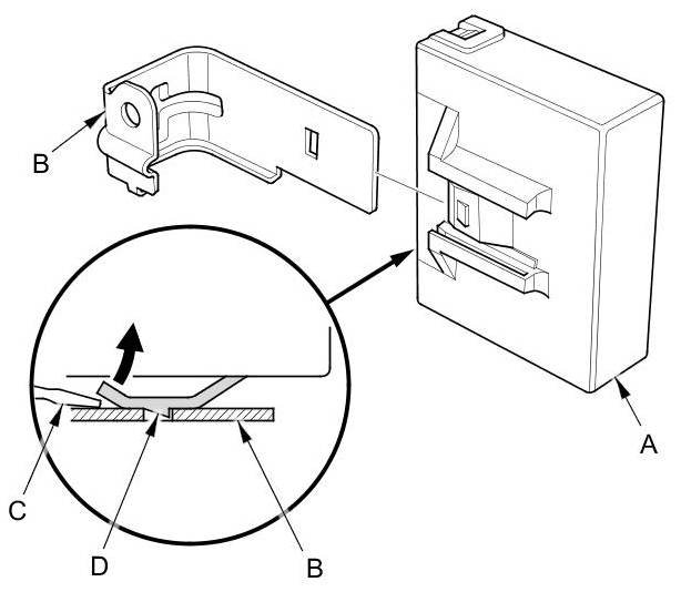 NOTE: To disconnect the TPMS control unit from its bracket, insert a small flat-tipped screwdriver (C) between the TPMS control unit and the bracket to release the hook (D), then slide out the TPMS control unit.