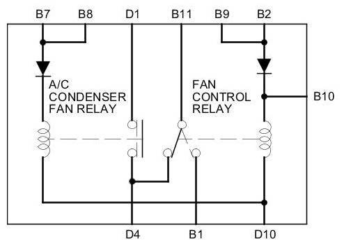 There should be continuity between terminals B1 and B11 when battery power is connected to terminal B2 (B9, or B10), and battery ground is connected to terminal D10. There should be continuity between terminals B11 and D4 when power is disconnected.