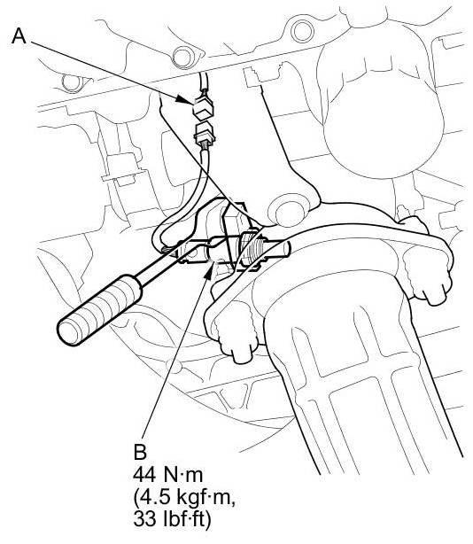2. Disconnect the secondary HO2S 4P connector (A), then remove secondary HO2S (B).