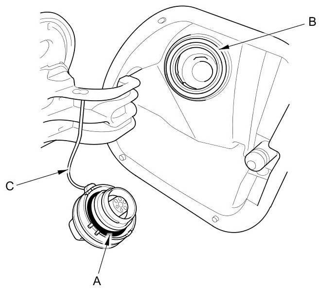 2. Check the fuel fill cap seal (A) and the fuel fill pipe mating surface (B). Verify that the fuel fill cap tether cord (C) is not caught under the cap.
