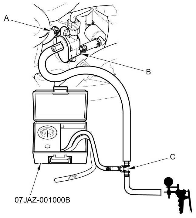 8. Disconnect the vacuum hose (A) from the EVAP canister purge valve (B) in the engine compartment, and connect a T-fitting (C), a vacuum gauge, and a vacuum pump/gauge 0-30 inHg to the EVAP canister purge valve as shown.