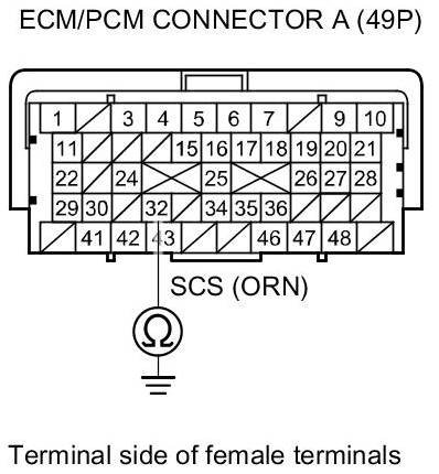 7. Check for continuity between ECM/PCM connector terminal A32 and body ground.