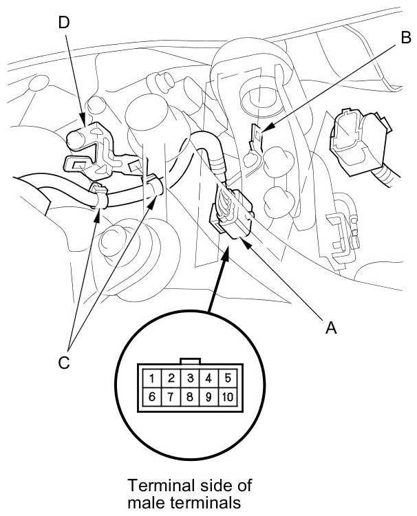 4. Remove the harness clamps (C) from the clamp bracket (D).