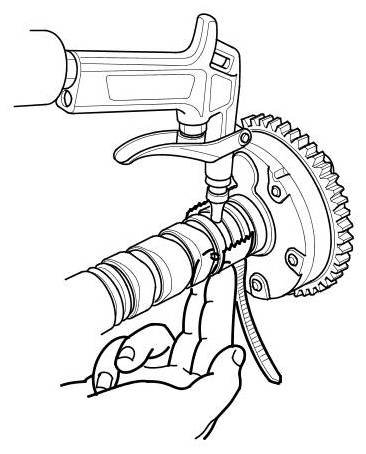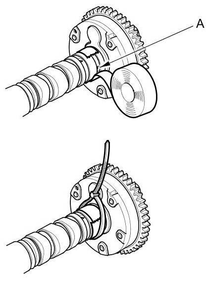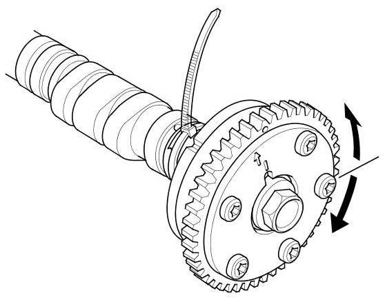 14. Hold the camshaft, and turn the VTC actuator clockwise until you hear it click. Make sure to lock the VTC actuator by turning it.