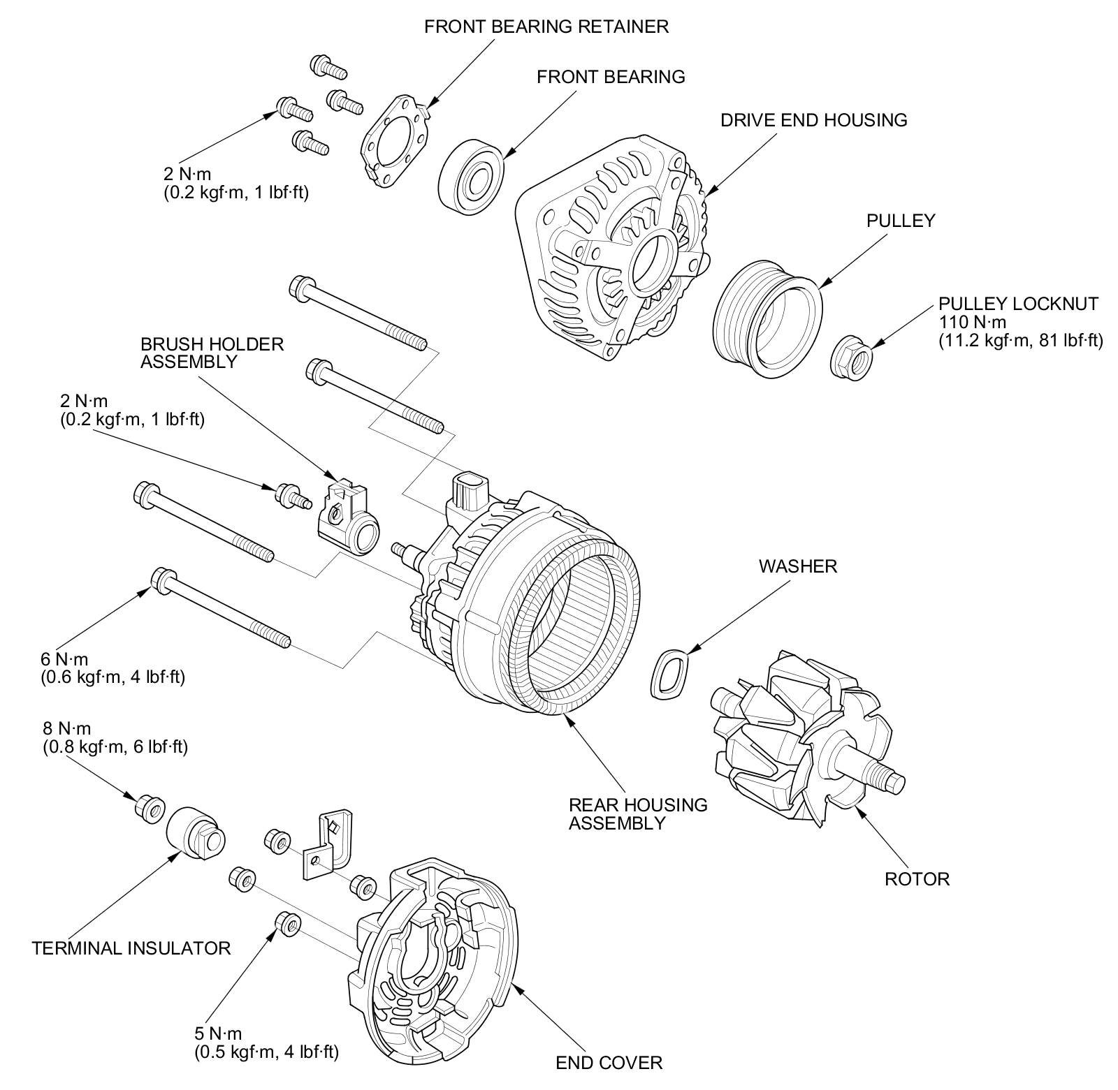 16. If you removed the pulley, put the rotor in the drive-end housing, then torque its locknut to 110 Nm (11.2 kg-m, 81 lb-ft).