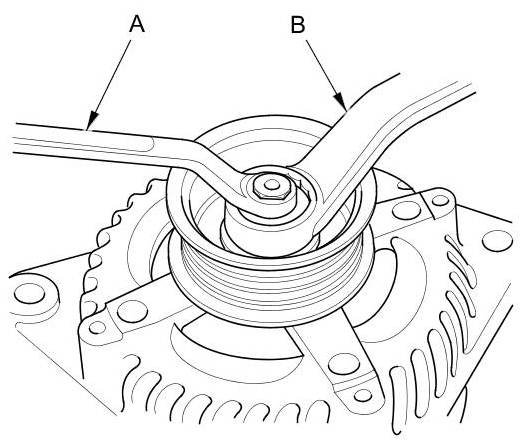3. If the front bearing needs replacing, remove the pulley locknut with a 10 mm wrench (A) and a 22 mm wrench (B). If necessary, use an impact wrench.