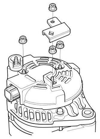 4. Remove the harness stay and the three flange nuts from the alternator.