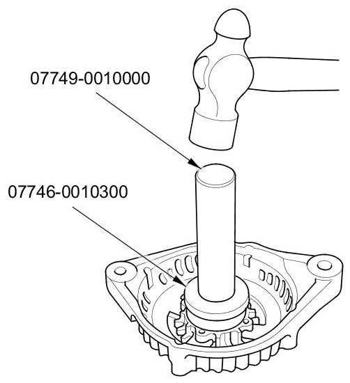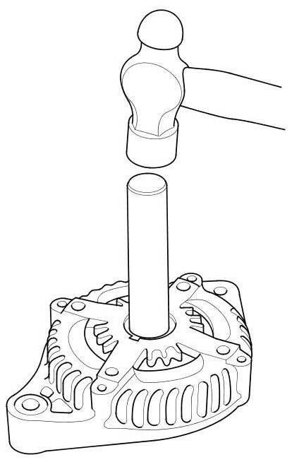 12. Install a new front bearing in the driver-end housing with a hammer, the driver handle, 15 x 135L, and the bearing driver attachment, 42 x 47 mm.