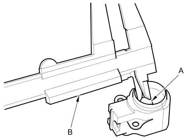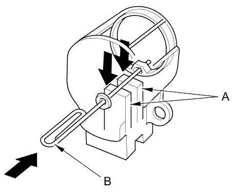 19. Push the brushes (A) in, then insert a pin or drill bit (B) (about 1.6 mm (1/16 in) diameter) to hold them there.