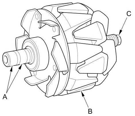 15. Check for continuity between each slip ring and the rotor (B) and the rotor shaft (C):