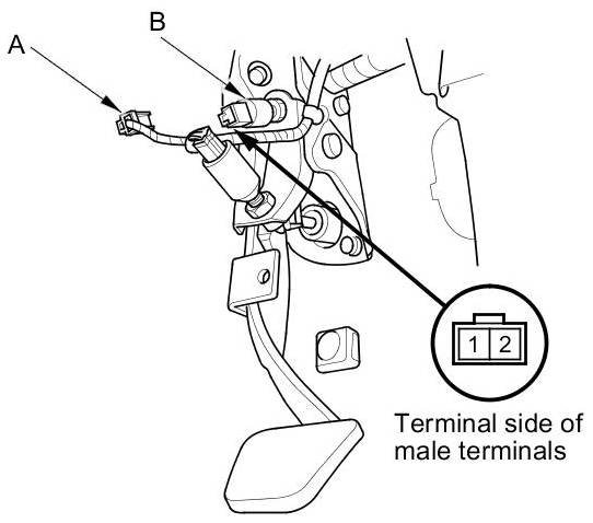 - If the continuity is not as specified, replace the clutch interlock switch (B) Clutch Interlock Switch Replacement, and adjust the pedal height Adjustments.