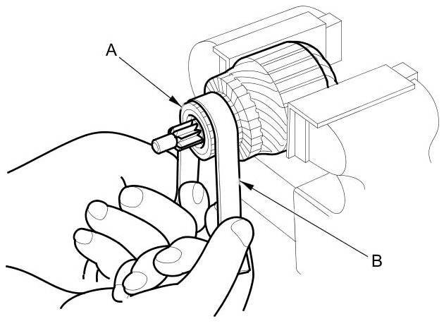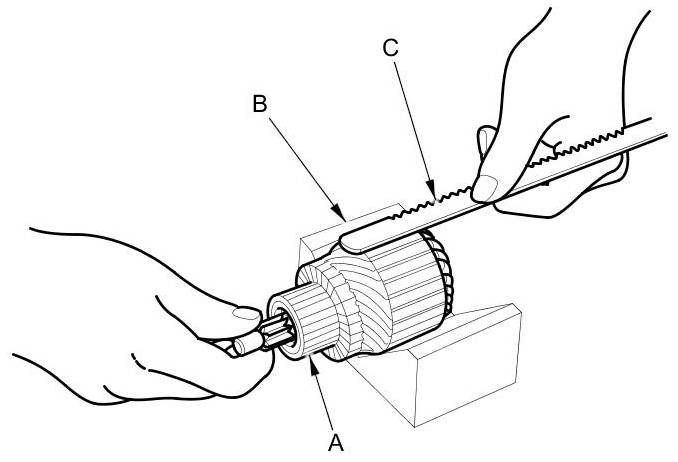 8. Place the armature (A) on an armature tester (B). Hold a hacksaw blade (C) on the armature core. If the blade is attracted to the core while the core is turned, the armature is shorted. Replace the armature.