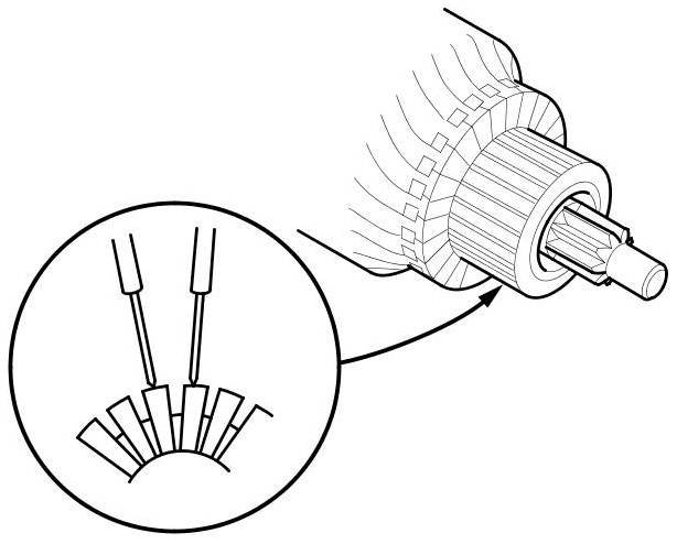 7. Use an ohmmeter to check for continuity between the segments of the commutator. If there is an open circuit between any of the segments, replace the armature.
