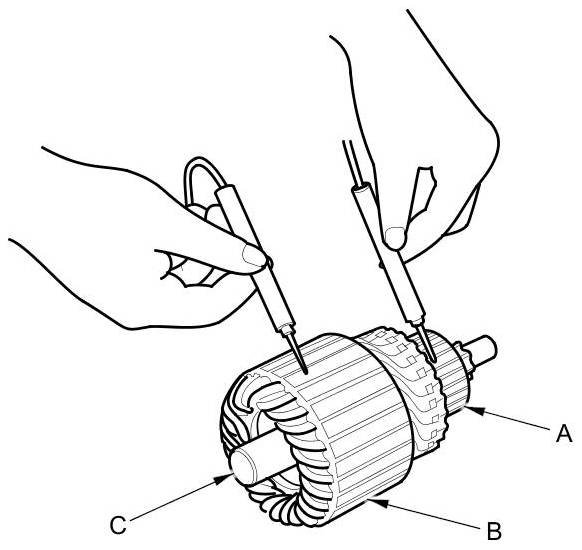 9. Use an ohmmeter to check for continuity between the commutator (A) and the armature coil core (B), and between the commutator and the armature shaft (C). If there is continuity, replace the armature.