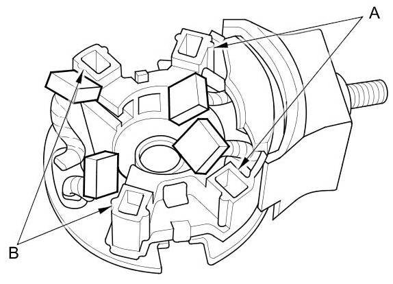 11. Check for continuity between the (+) brush holders (A) and the (-) brush holders (B). If there is continuity, replace the brush holder assembly.