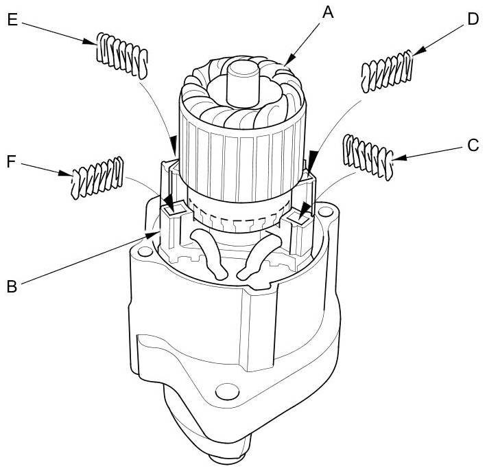 17. While squeezing a brush spring (C), insert it in the hole on the brush holder, and push it until it bottoms. Repeat this for the other three springs (D, E, and F).