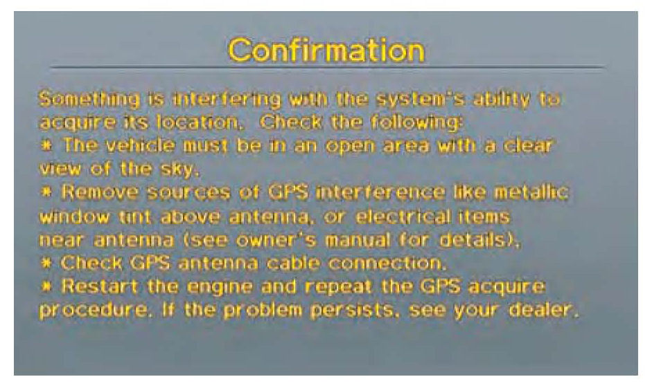 5. If the system does not initialize within 10 minutes, a second screen (shown) appears. The system is still initializing but will not automatically exit to the globe screen when the initialization is complete. Do not immediately follow the instructions on the screen. After 30 minutes, try restarting the engine to see if the navigation system completed the initialization. If it did not, follow the instructions on the screen.