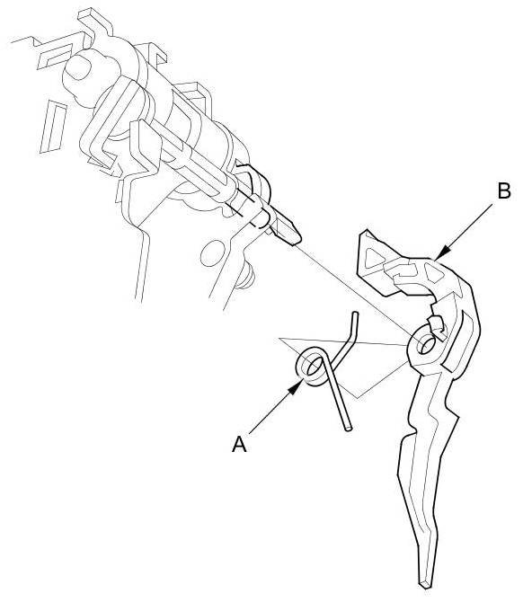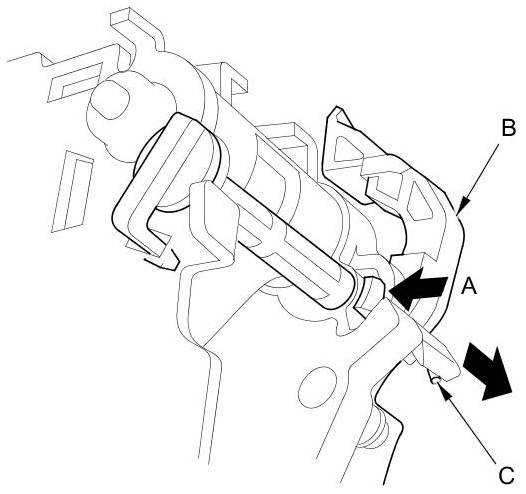 2. Release the lock tab (A) of the shift lock release (B), then remove the shift lock release and the release spring (C).