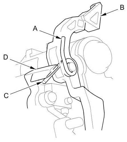 11. Make sure that the release spring end (A) is installed in the shift lock release (B), and the other end (C) of the release spring is on the stop (D).