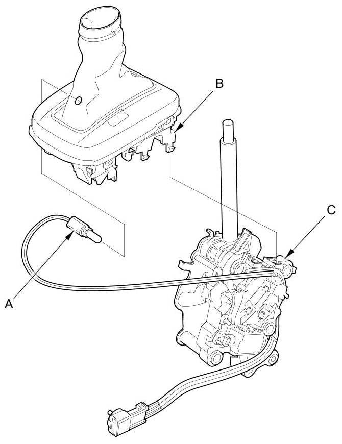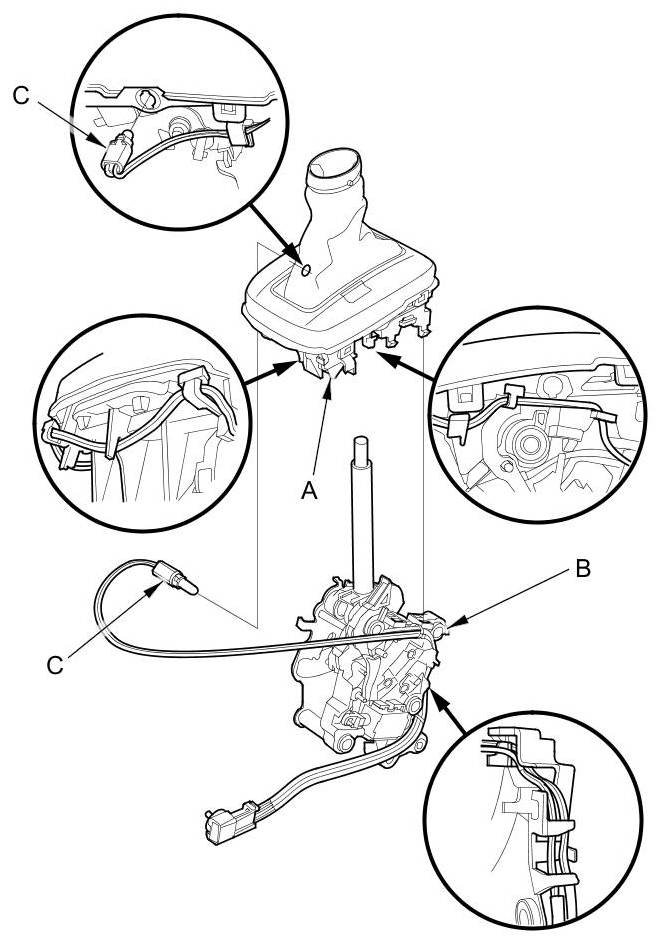 12. Install the A/T gear position indicator panel light socket (C) in the A/T gear position indicator panel base.