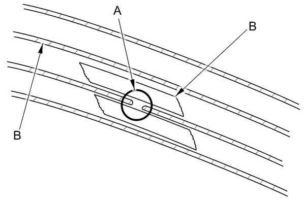 3. Using a small brush, apply a heavy coat of silver conductive paint (commercially available) (A) extending about 3.0 mm (0.1 in) on both sides of the break. Allow 25 minutes to dry.