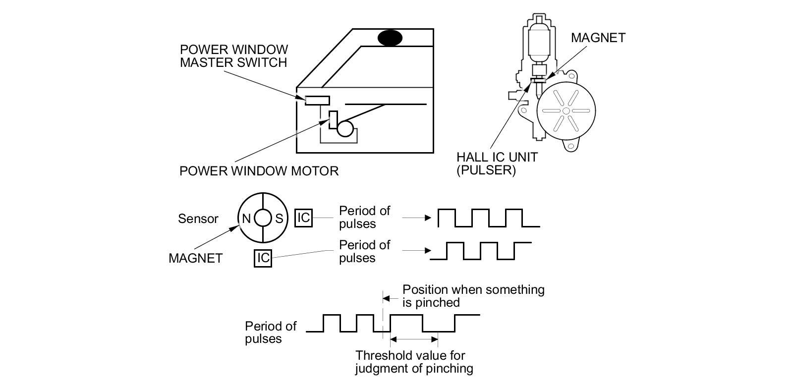 The driver's and front passenger's power window motors incorporate a Hall IC unit (pulser) which generates pulses during the motor's operation and sends pulses to the driver's and passenger's power window control units. As soon as the power window control units detect a change in the pulse frequency from the Hall IC unit (pulser), the power window control units make the power window motor stop and reverse. This prevents pinching your hand or fingers during auto-up operation. The auto reverse function does not work when the power window master switch is held in the closed position.
