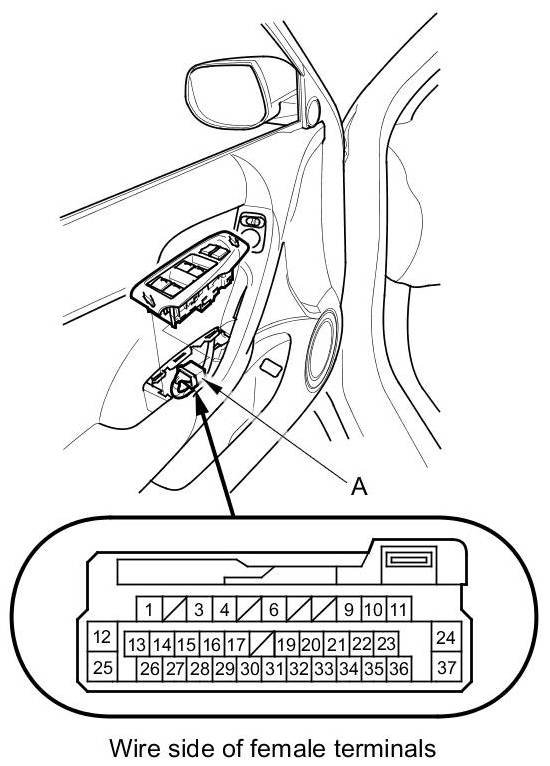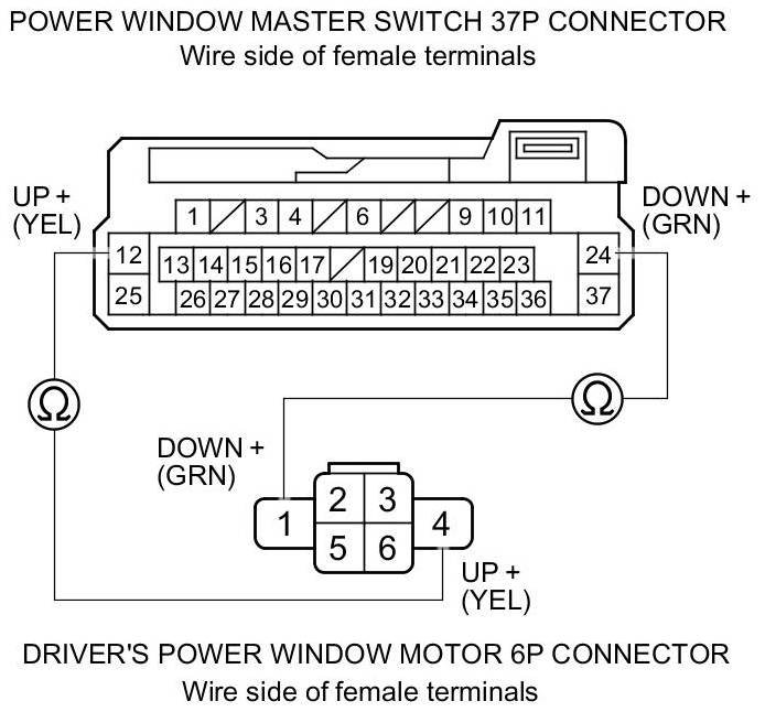 6. Check for continuity between power window master switch 37P connector terminals No. 12 and No. 24, and driver's power window motor 6P connector terminals No. 4 and No. 1 respectively. There should be continuity.
