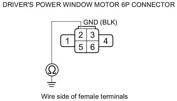 8. Check for continuity between driver's power window motor 6P connector terminal No. 2 and body ground. There should be continuity.