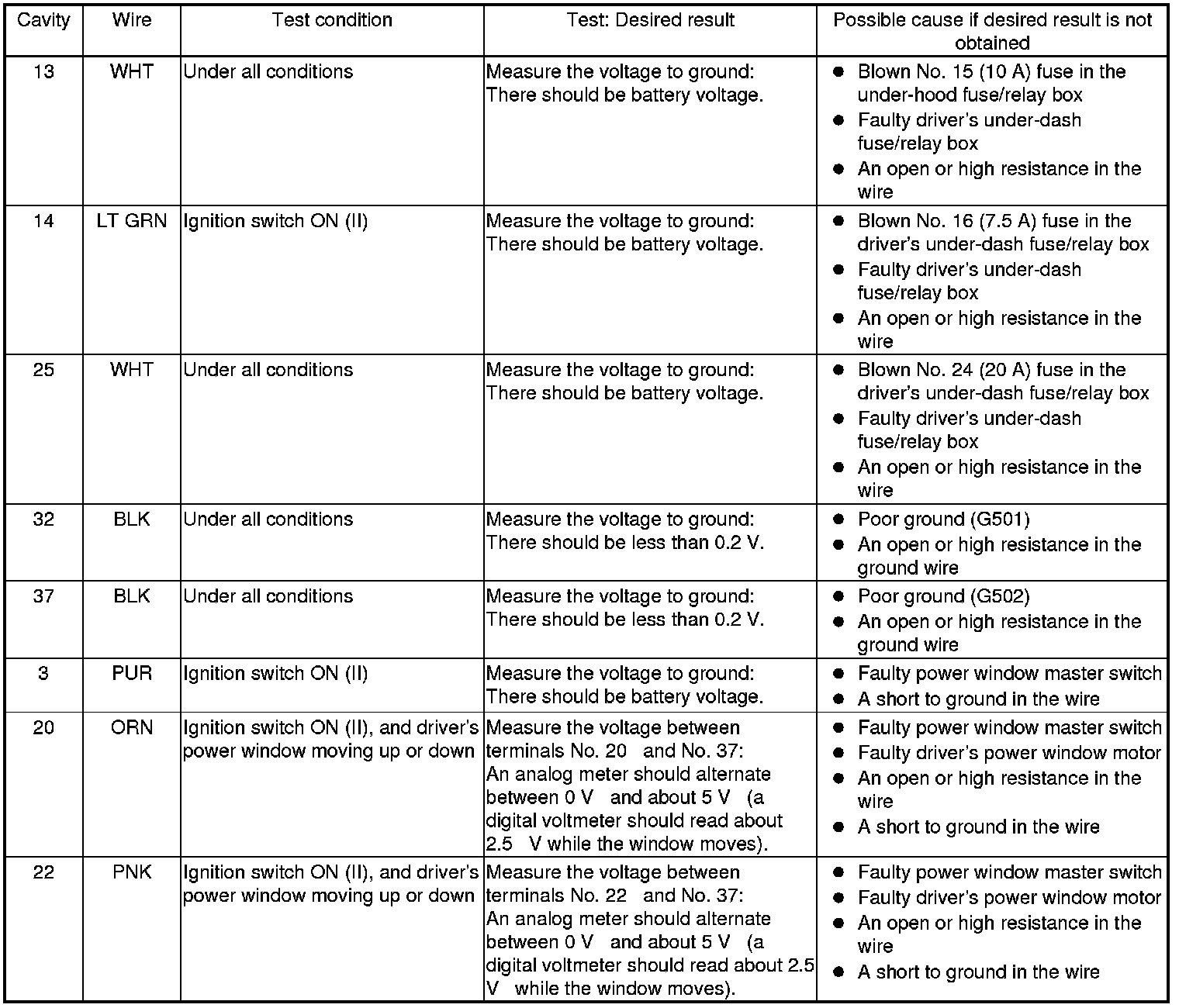 - If all the input tests prove OK, the door multiplex control unit must be faulty, replace the power window master switch Power Window Master Switch Replacement.