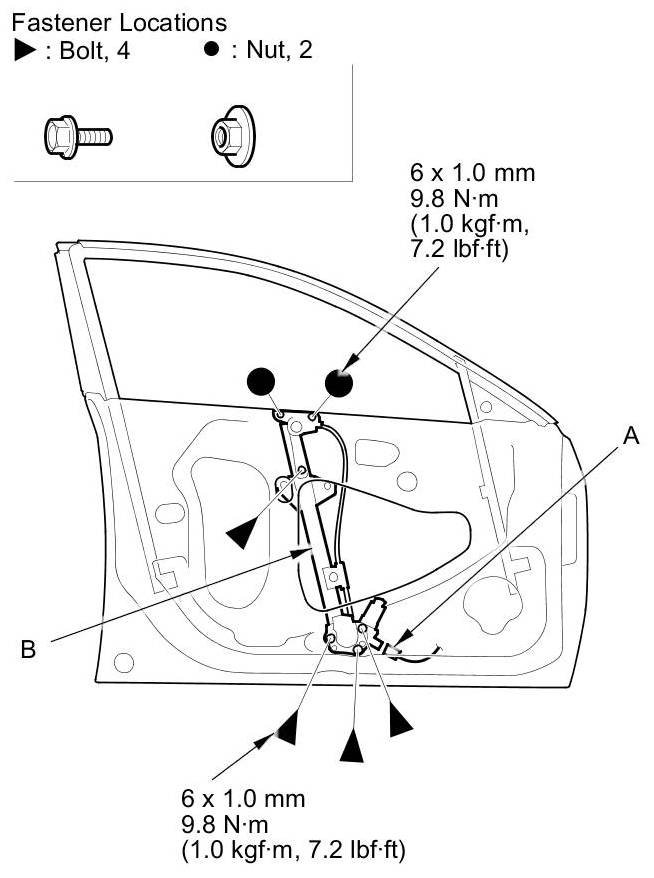 7. Remove the bolts and the nuts, then remove the regulator through the hole in the door.