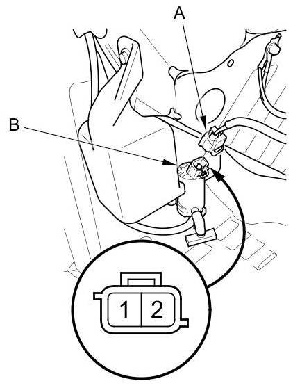 2. Disconnect the 2P connector (A) from the windshield/rear window* washer motor (B).