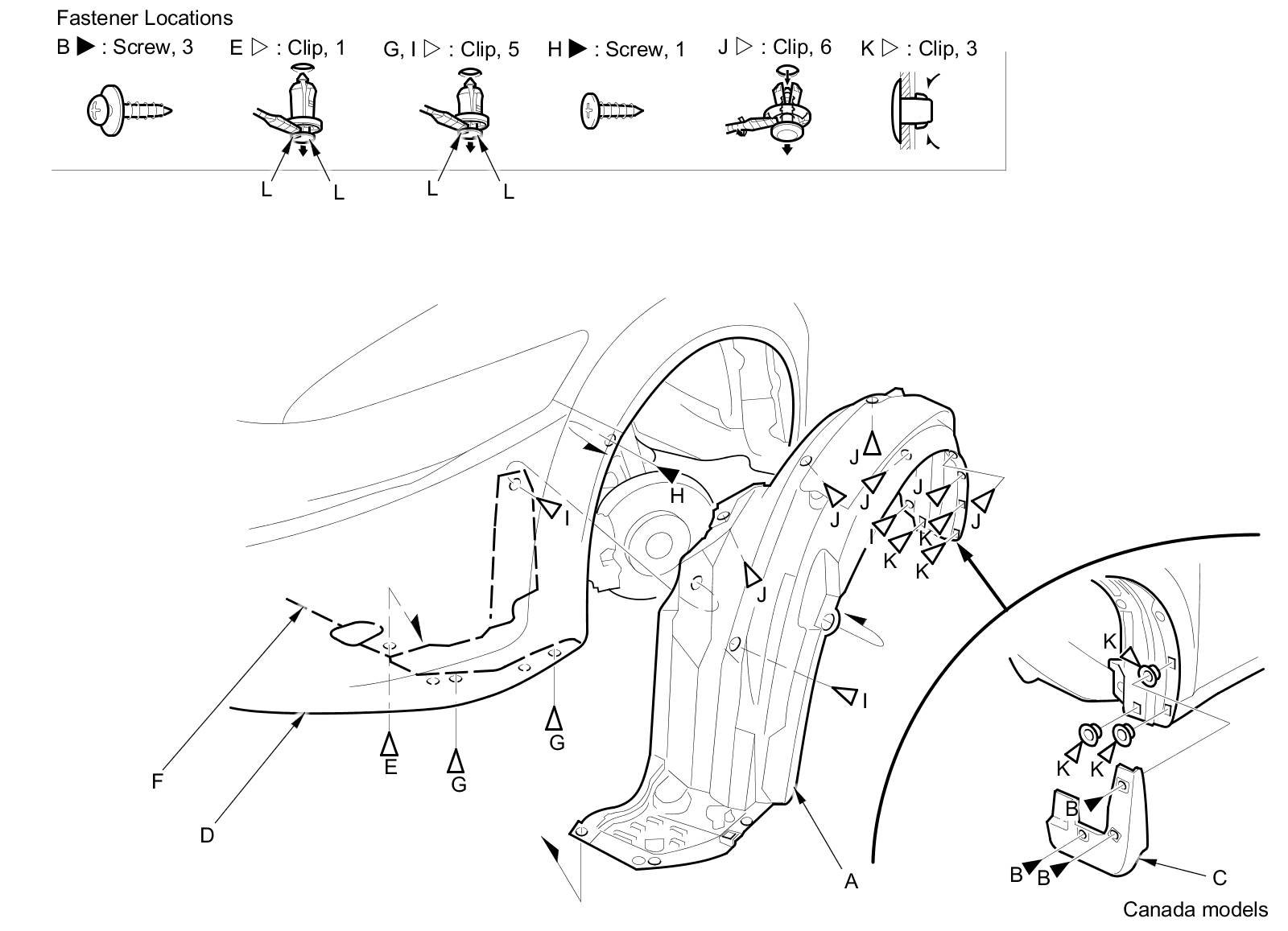 4. From the wheel arch, detach the clips (I, J, K) securing the front inner fender (and splash shield) to the body.