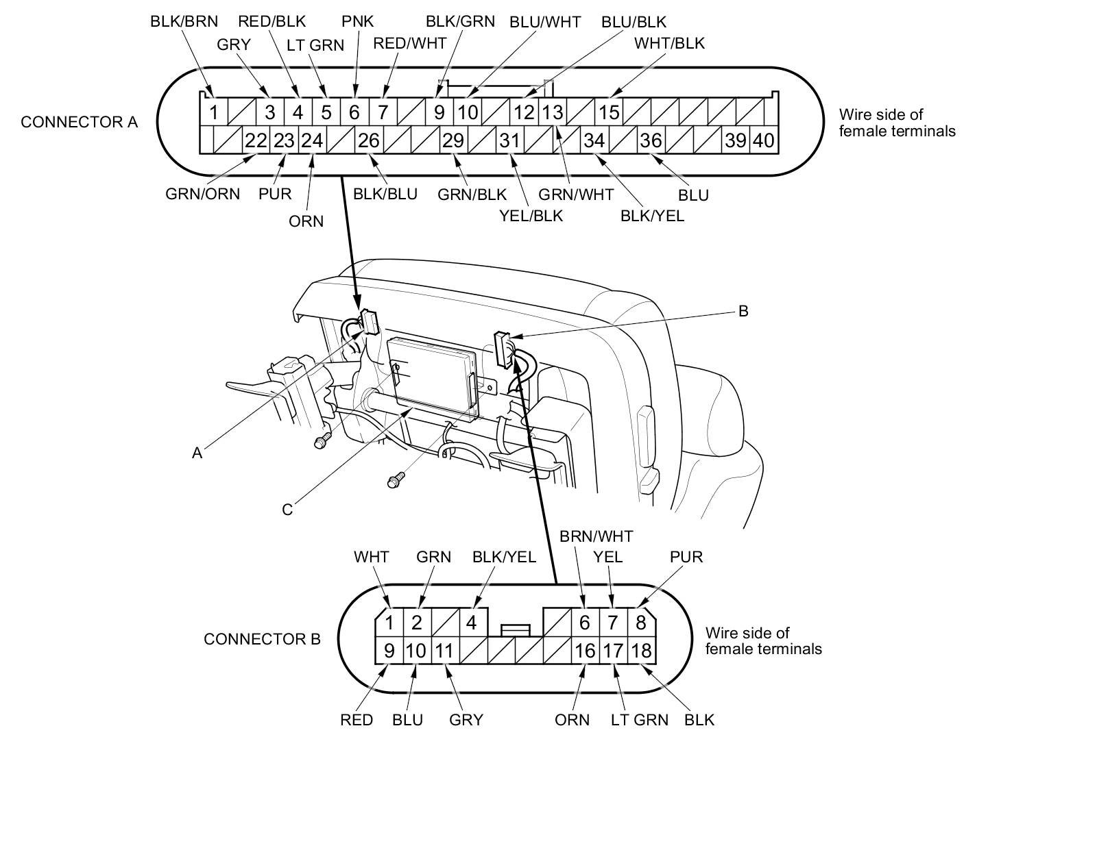 3. Disconnect the 40P connector (A) and 18P connector (B) from the power seat control unit (C).