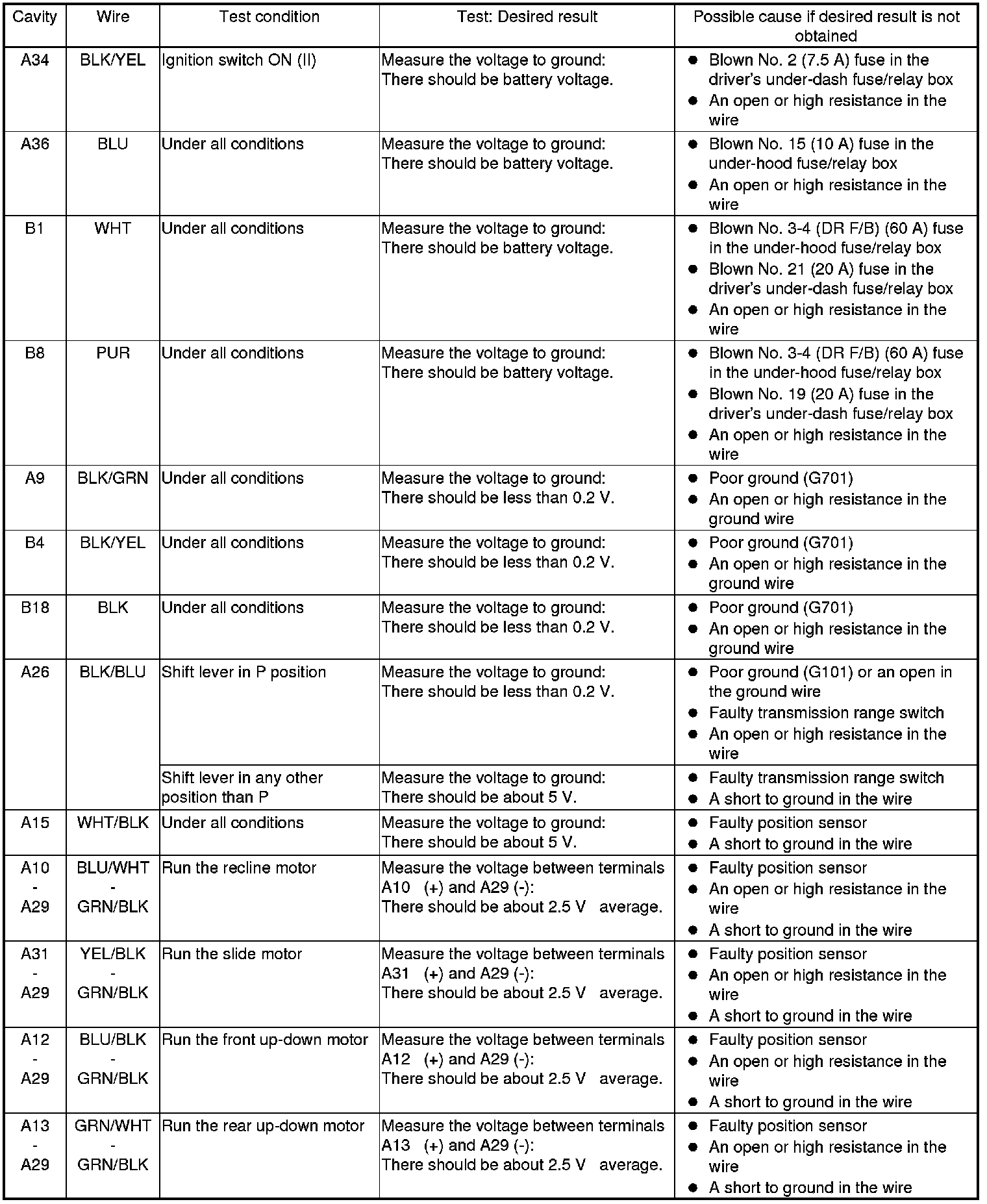 7. Disconnect the connectors from the power seat control unit, and do the following input tests: