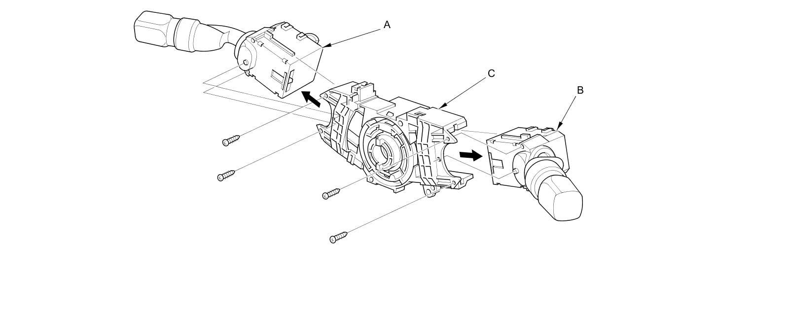5. Remove the combination light switch (A) and the wiper/washer switch (B) from the combination switch body assembly (C).