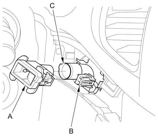 3. Pull out the in-car temperature sensor (A), disconnect the connector (B), and remove the in-car temperature sensor from the aspirator hose (C).