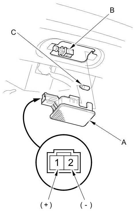 4. Check for continuity between terminals No. 1 (+) and No. 2 (-). There should be continuity. If there is no continuity, check the bulb (C). If the bulb is OK; replace the trunk light assembly.